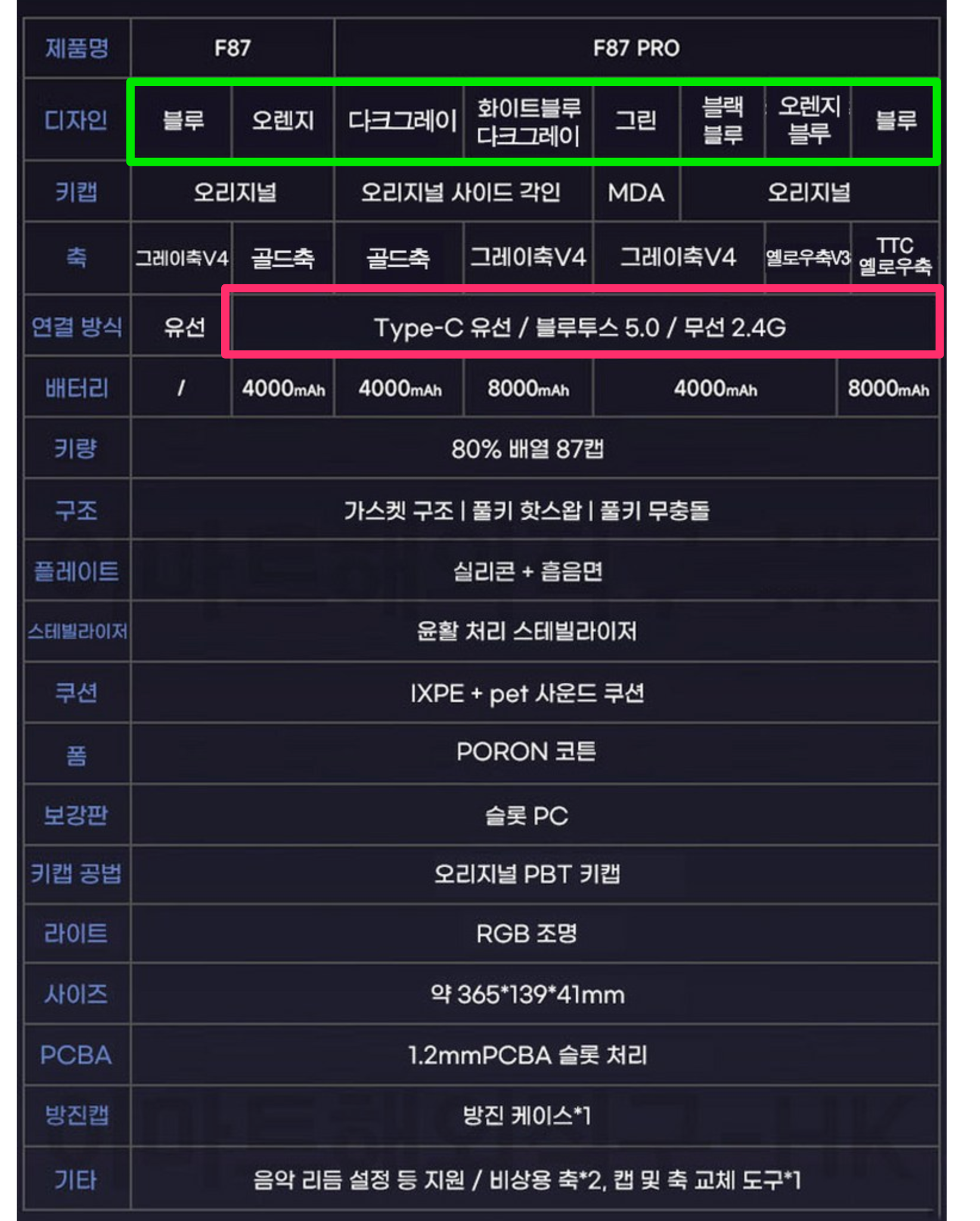색상이 다크그레이, 화이트블루, 그린, 블랙블루, 오렌지블루, 블루가 아니라면 일반 F87임을 알 수 있고요, Pro가 아닌 일반 모델은 색상에 따라 유선만 지원할 수 있다는 점 참고하면 되겠습니다. 무선 연결 방식이 반드시 필요하신 분은 왠만하면 F87 Pro 버전에서 마음에 드는 색을 선택하시는게 나을 것 같습니다.
