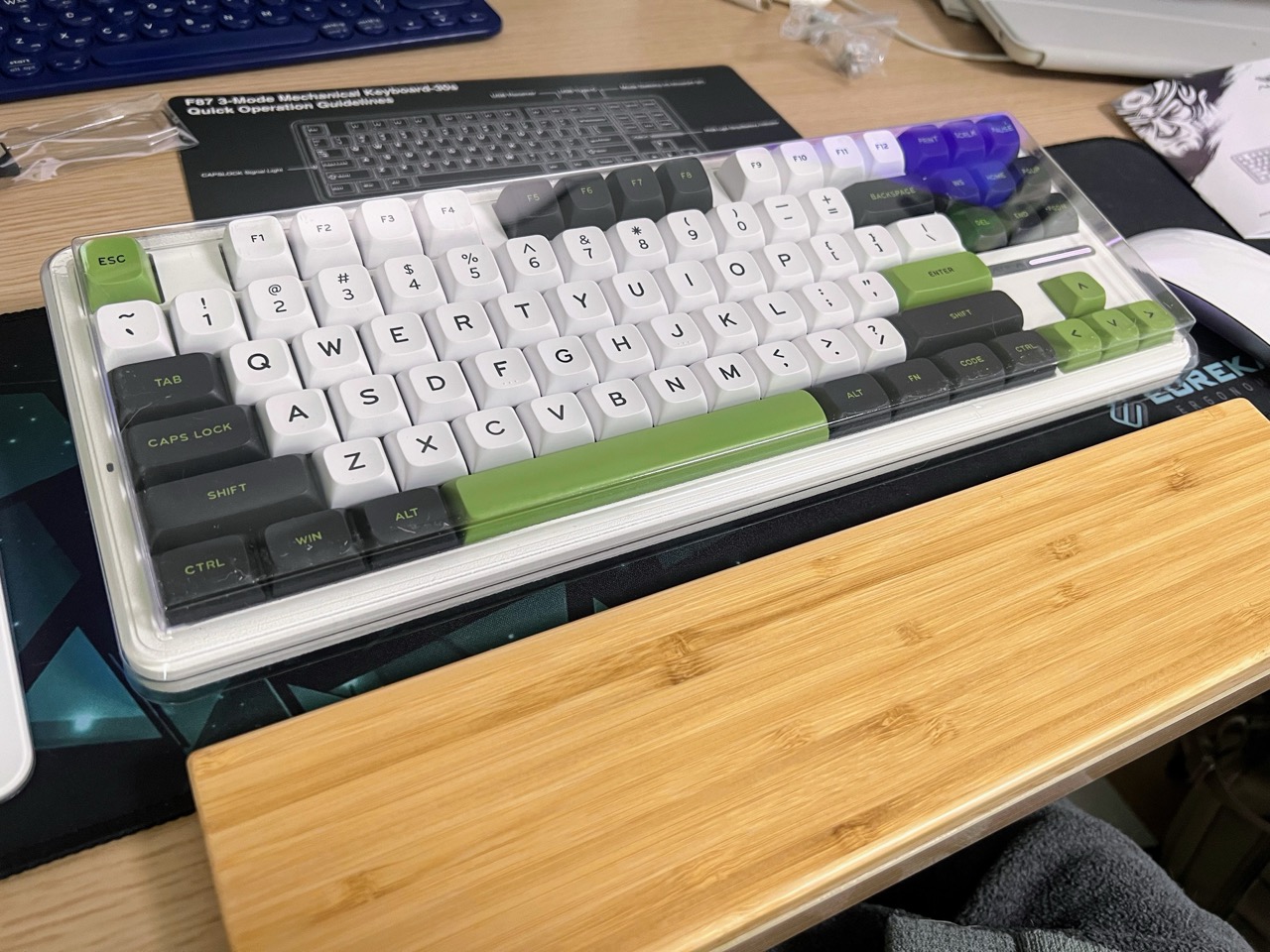 아 맞다. 기계식 키보드는 굉장히 두껍기 때문에 손목 받침대는 필수입니다. 제가 구매한 건 제닉스 대나무 손목 받침대로 저렴하고 굉장히 무난합니다. F87이 온 날, 운좋게도 함께 왔네요. 손목 받침대 무난한 걸 찾고 있다면, 해당 제품 강력 추천드립니다.